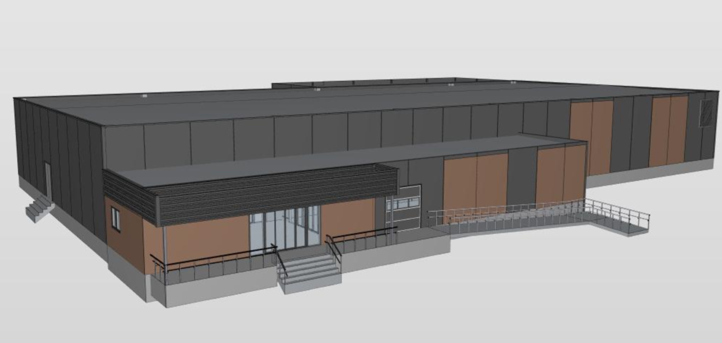 Utvidelse med nytt lager og inngangspart, hele bygget rives inntil bærekonstruksjonen av betong.